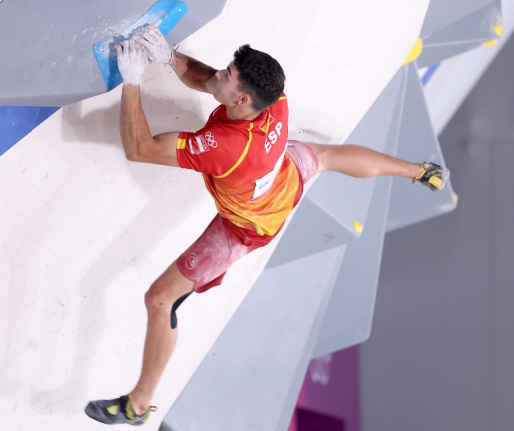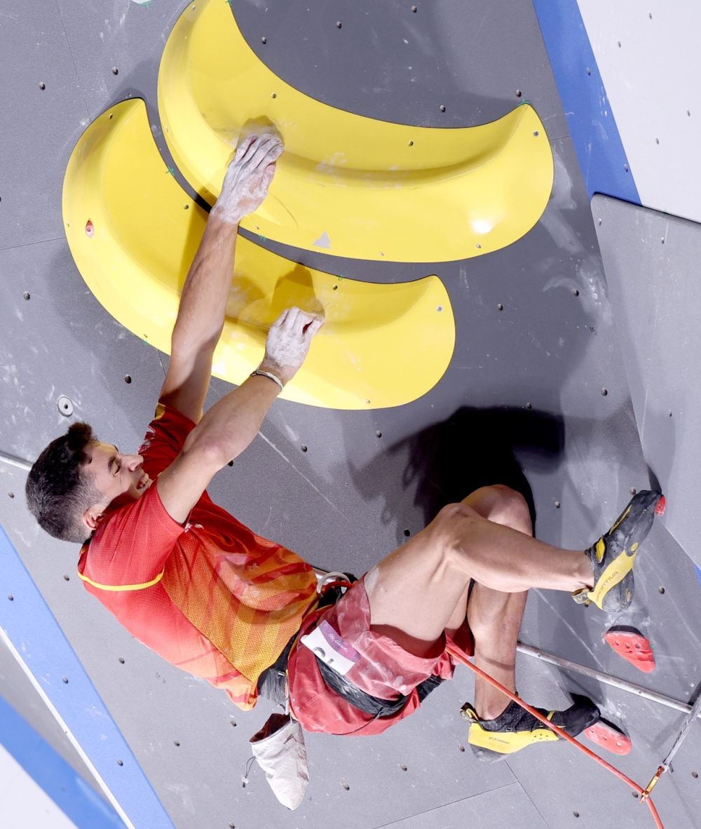 8月5日,西班牙选手阿尔贝托·吉尼斯·洛佩兹在男子全能攀石项目的比赛中。