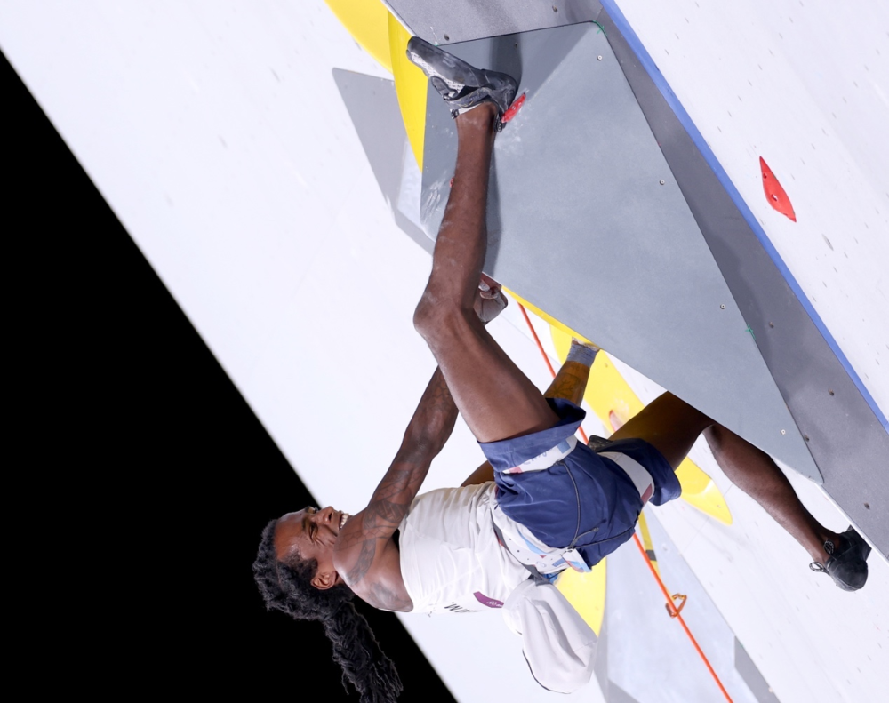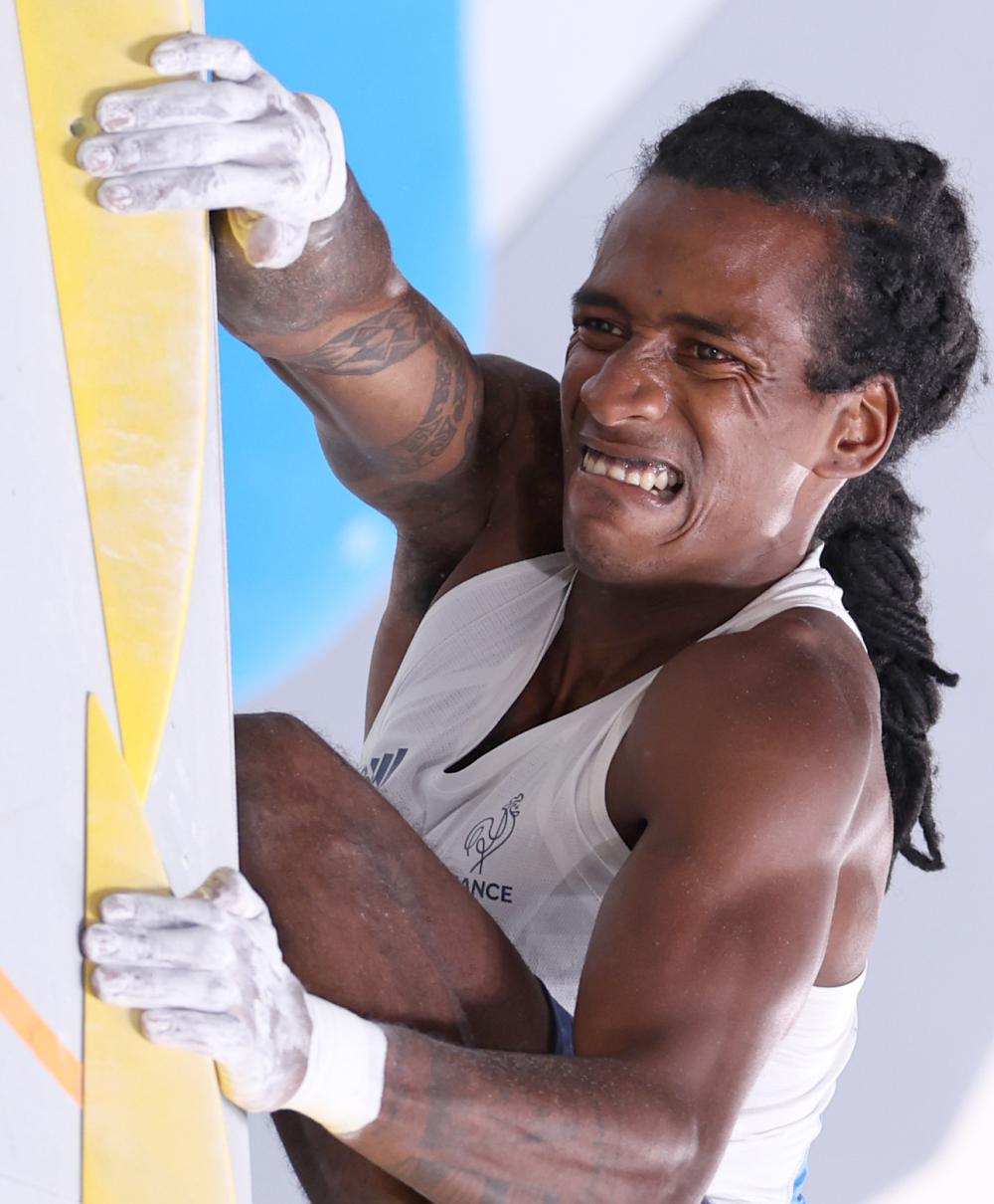 8月5日,法国选手米克尔·马文在男子全能攀石决赛项目的比赛中。