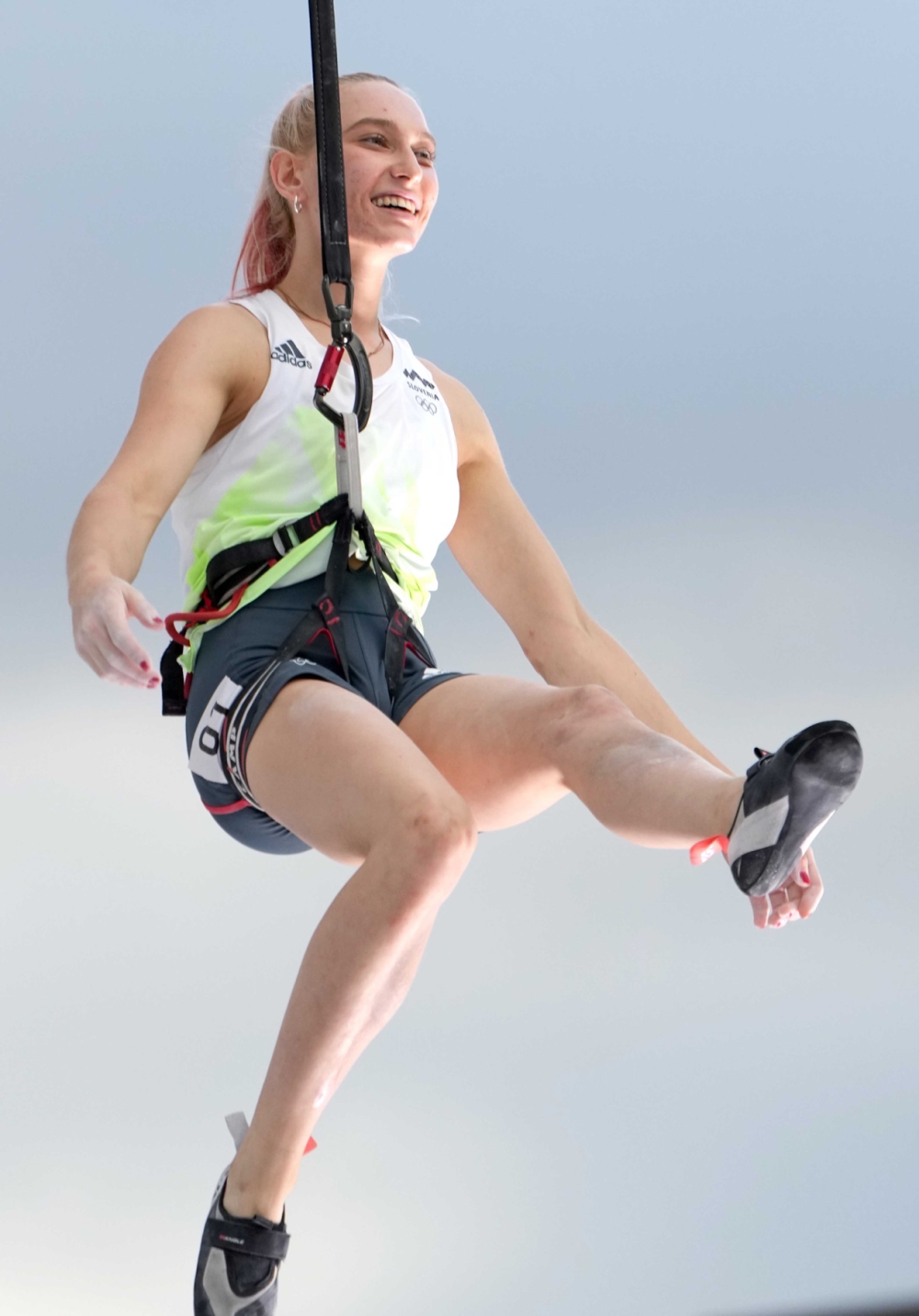 8月6日,斯洛文尼亚选手加恩布雷特在女子全能攀石决赛中完赛后露出笑容。