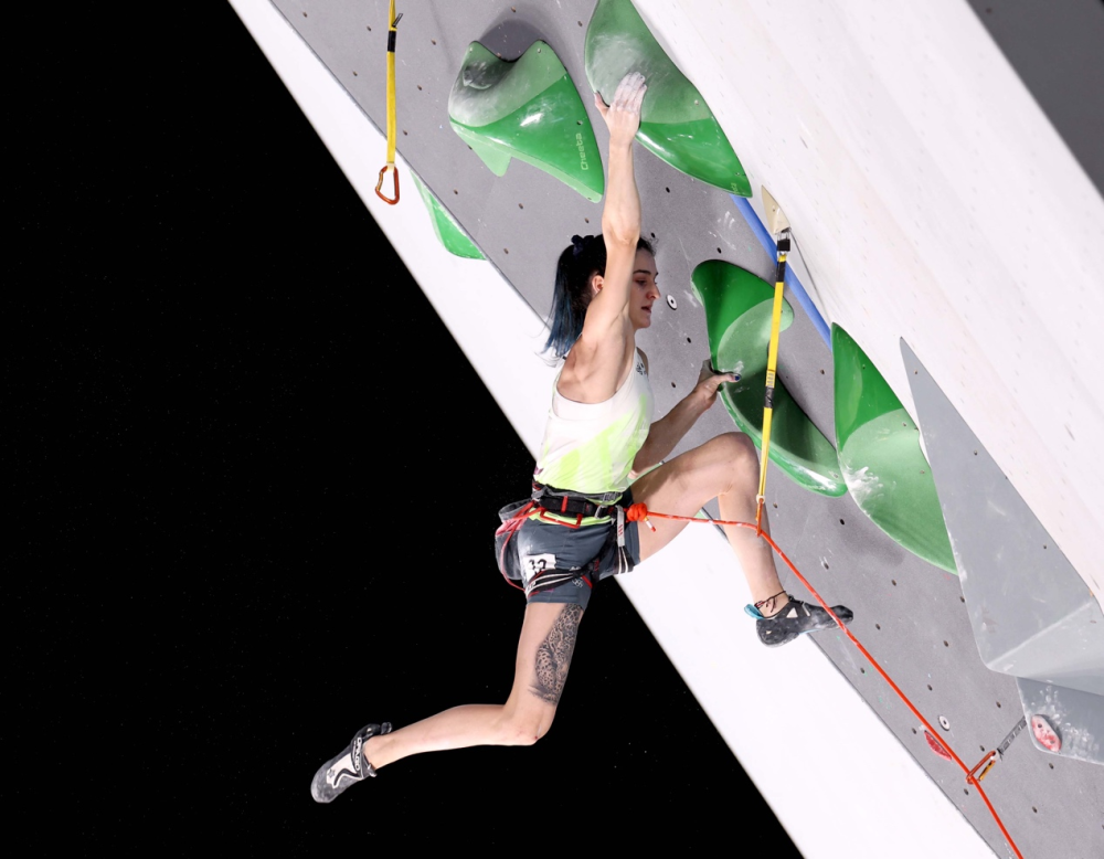 8月4日,中国选手宋懿龄在攀岩难度项目的比赛中。