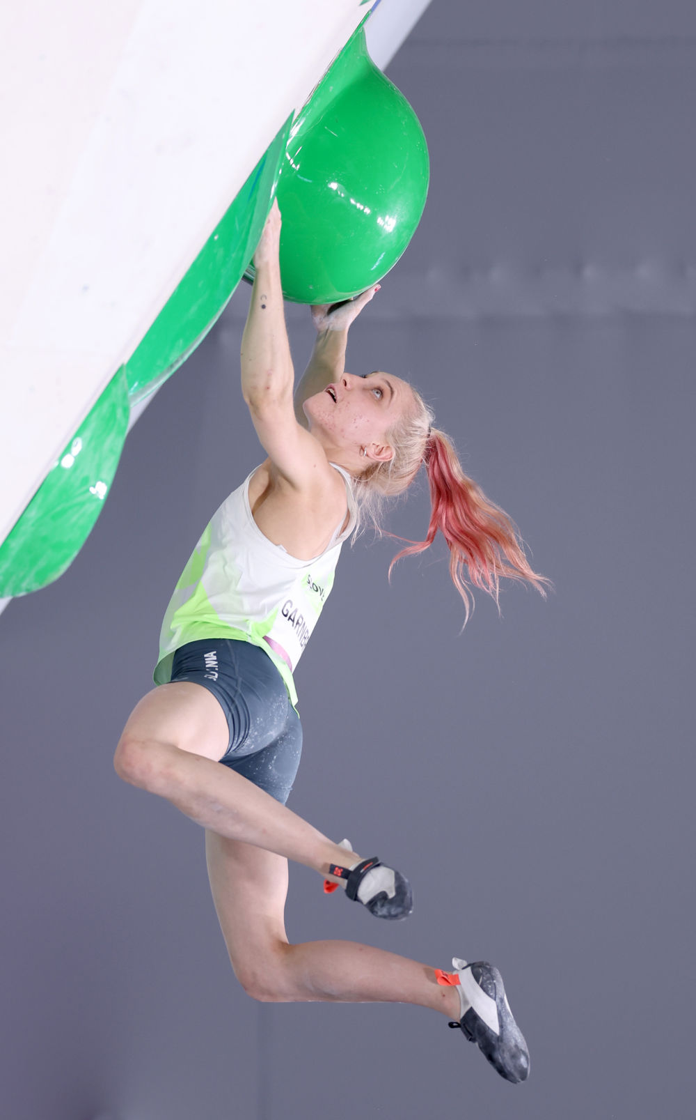 8月6日,斯洛文尼亚选手加恩布雷特在竞技攀岩攀石项目的比赛中。
