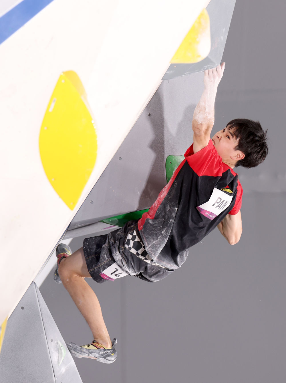 8月3日,潘愚非在攀岩男子攀石预赛中。