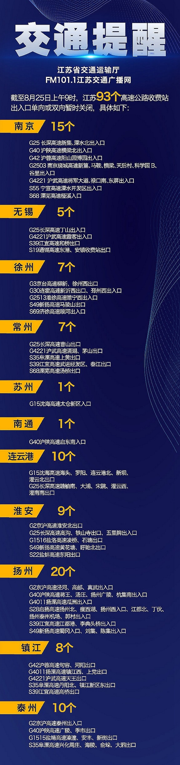 今日,记者从江苏省交通运输厅获悉,截至8月25日上午9时,南京、无锡、徐州、常州、苏州、南通、连云港、淮安、扬州、镇江、泰州等地区93个高速公路收费站出入口单向或双向暂时关闭,具体如下: