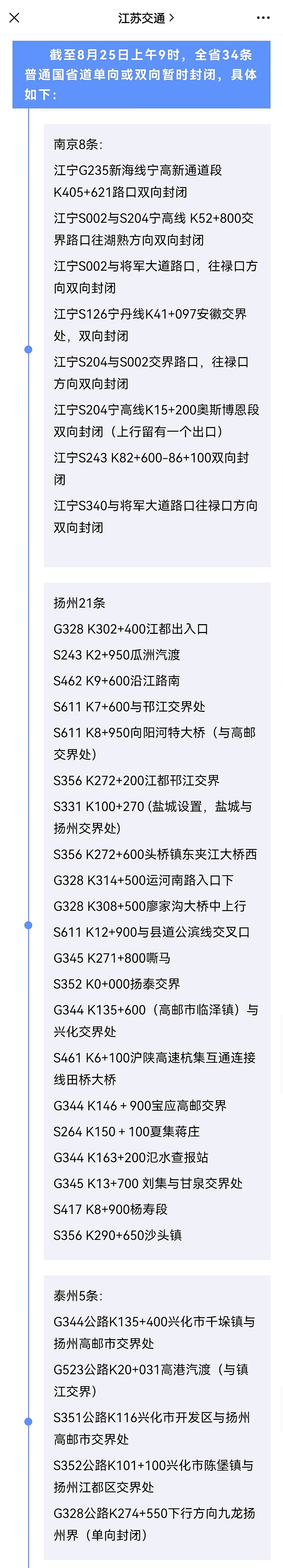 截至8月25日上午9时,江苏全省34条普通国省道单向或双向暂时封闭,具体如下:
