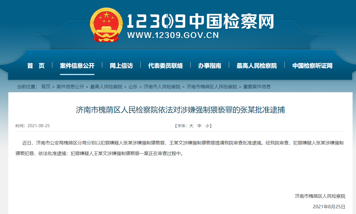 央视网消息:近日,济南市公安局槐荫区分局分别以犯罪嫌疑人张某涉嫌强制猥亵罪、王某文涉嫌强制猥亵罪提请我院审查批准逮捕。经我院审查,犯罪嫌疑人张某涉嫌强制猥亵犯罪,依法批准逮捕;犯罪嫌疑人王某文涉嫌强制猥亵罪一案正在审查过程中。