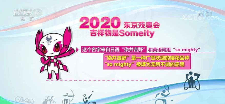 2020东京残奥会的吉祥物是Someity,这个名字来自日语“染井吉野”和英语词组“so mighty”。“染井吉野”是一种广受欢迎的樱花品种,“so mighty”被译为无所不能的意思。