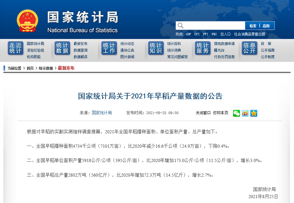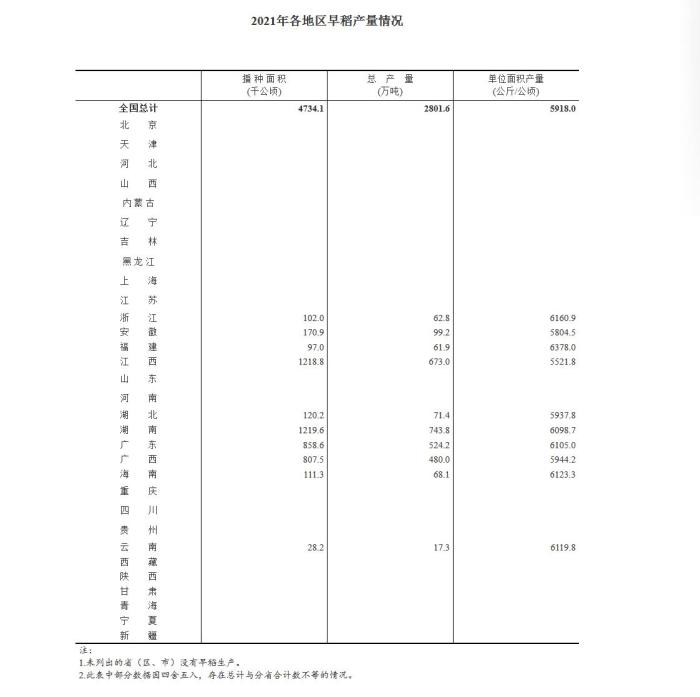 根据对早稻的实割实测抽样调查推算,2021年全国早稻播种面积、单位面积产量、总产量如下: