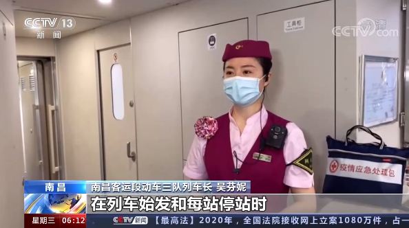 南昌客运段动车三队列车长 吴芬妮:在列车始发和每站停站时,遇有未携带口罩的旅客,列车还会为旅客免费提供口罩使用,加大防控举措落实力度。