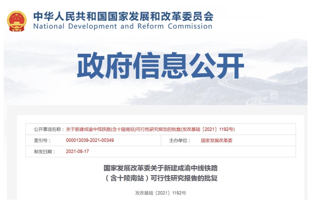 国家发展改革委近日正式批复新建成渝中线铁路可行性研究报告。