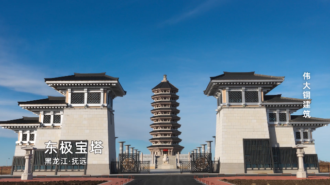 东极宝塔采用青铜瓦铺盖,全铜制作,并用专门设计的滴水、勾头图案再现“龙戏东珠”的意象和内涵,达到传统文化底蕴和现代形式的高度统一,形成浑然一体的建筑艺术旷世珍品。