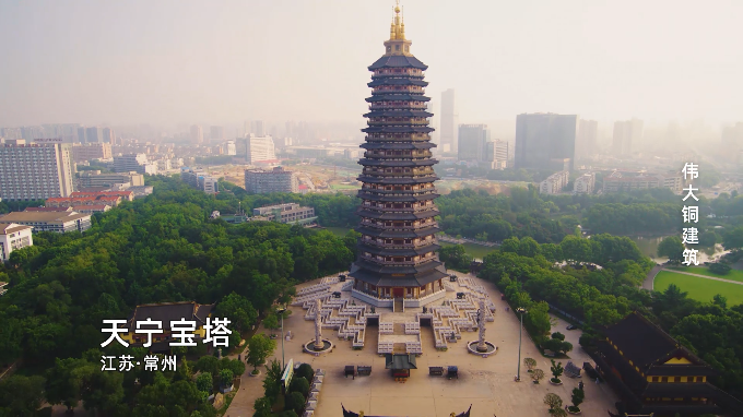 宝塔采用唐宋楼阁式的风格,高153.79米,以祥瑞宁吉为根本,为天宁塔创制铭文瓦及铭文,每层分别设“天”“宁”“人”“地”主题,突现盛巨造塔的历史文化内涵。