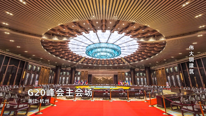 G20峰会主会场正上方的斗拱穹顶、铜门、西子国宾馆国宴厅的《龙凤呈祥》铜壁画等,是由国内铜匠近百人共同建造完成。以传统的非遗技艺融合创新元素,精工细作了上万平方米的铜饰面,完成了主会场的铜工程和陈列在各场馆的60余件艺术品。