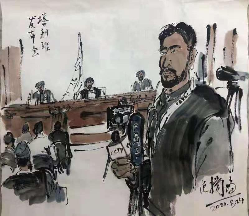 8月24日下午,塔利班在喀布尔举行第二场发布会。中央广播电视总台报道员奥贝德不辱使命,第一时间在发布会现场发回独家报道。著名画家范扬有感于总台报道员的敬业精神,挥毫描绘了其现场采访的情景。