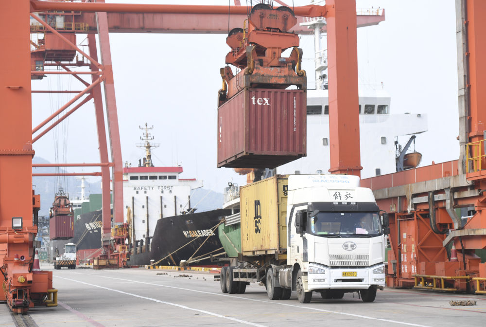 这是6月3日,在中国(福建)自由贸易试验区福州青州集装箱码头,大型机械在吊装集装箱。(新华社记者宋为伟摄)