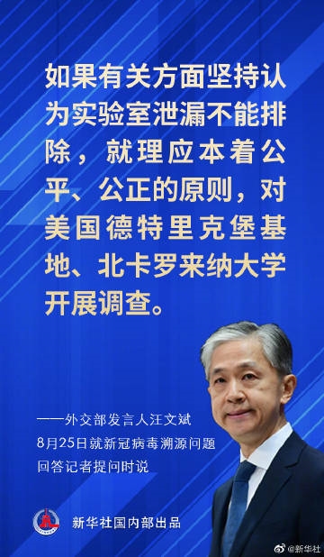 对此,外交部发言人汪文斌8月25日在例行记者会上表示,中方对全球溯源问题的立场是一贯的、明确的。溯源是科学问题,中方始终支持并将继续参加科学溯源。中国-世卫组织联合研究报告得出了国际社会和科学界公认的结论和建议,必须得到尊重和实施,今后全球溯源工作应该也只能在此基础上开展。武汉病毒研究所已两次接待世卫组织专家组,新冠病毒源自武汉病毒研究所泄漏极不可能,这是中国-世卫组织联合研究报告得出的明确结论。如果有关方面坚持认为实验室泄漏不能排除,就理应本着公平、公正的原则,对美国德特里克堡基地、北卡罗来纳大学开展调查。