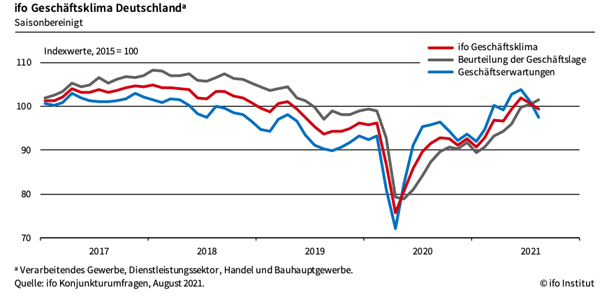 伊弗经济研究所所长克莱门斯·菲斯特25日在一份声明中指出,德国的大部分受访企业对行业经营现状的评估要比上个月更积极,8月商业景气指数的下跌主要是归咎于他们对接下来数月的发展预期较为悲观,特别是对餐饮和旅游业的担忧。另外,制造业中间产品的供应瓶颈以及人们对感染数字再次反弹的焦虑,令德国经济承压日益增多。