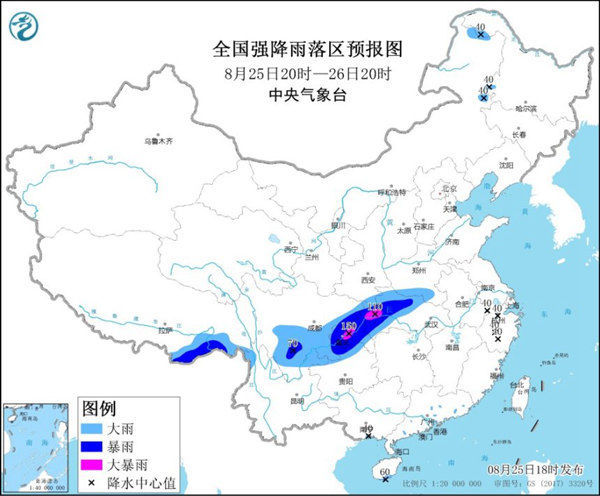 中央气象台8月25日18时继续发布暴雨蓝色预警:预计,8月25日20时至26日20时,四川东部和南部、重庆、贵州北部、湖北西部和北部、陕西东南部、河南南部、云南东北部和西北部、西藏东南部、内蒙古东北部等地部分地区有大到暴雨,其中,重庆局地有大暴雨(100~150毫米)。上述部分地区伴有短时强降水(最大小时降雨量20~50毫米,局地可超过60毫米),局地有雷暴大风等强对流天气。详情>>>