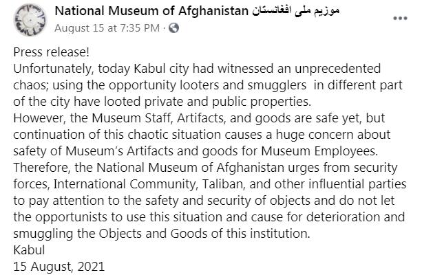 8月15日塔利班控制首都喀布尔之后,阿富汗国家博物馆曾在官方社交账号上发布公告,恳请安保机构、国际机构和塔利班等相关人员关注博物馆的安全问题,不要做出破坏或盗卖文物的行为。