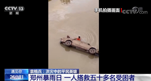 袁格兵:水流特别急,直接把我打到大概有200米远的距离,之后刚好冲下来一个车,车顶上还有一个人,最后我把那个绳和那个泡沫扔给那个人,那个人用绳拴到路灯上面,最后把那个大爷平安的弄上岸了。