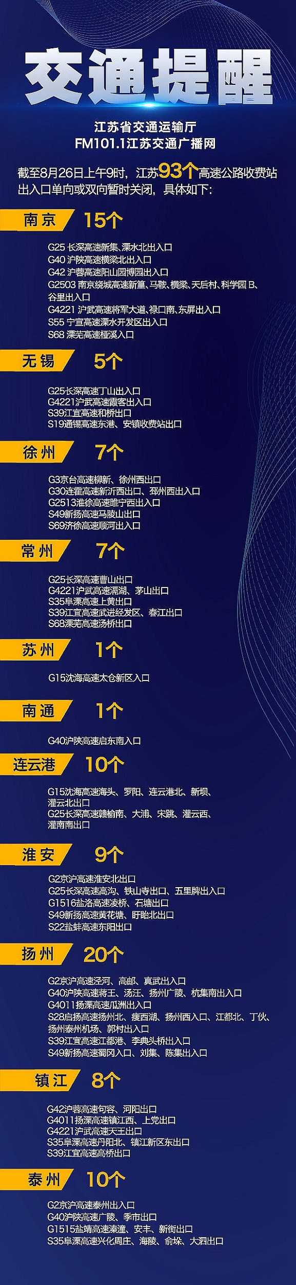 今天(26日),记者从江苏省交通运输厅了解到,截至8月26日上午9时,南京、无锡、徐州、常州、苏州、南通、连云港、淮安、扬州、镇江、泰州等地区93个高速公路收费站出入口单向或双向暂时关闭,具体如下: