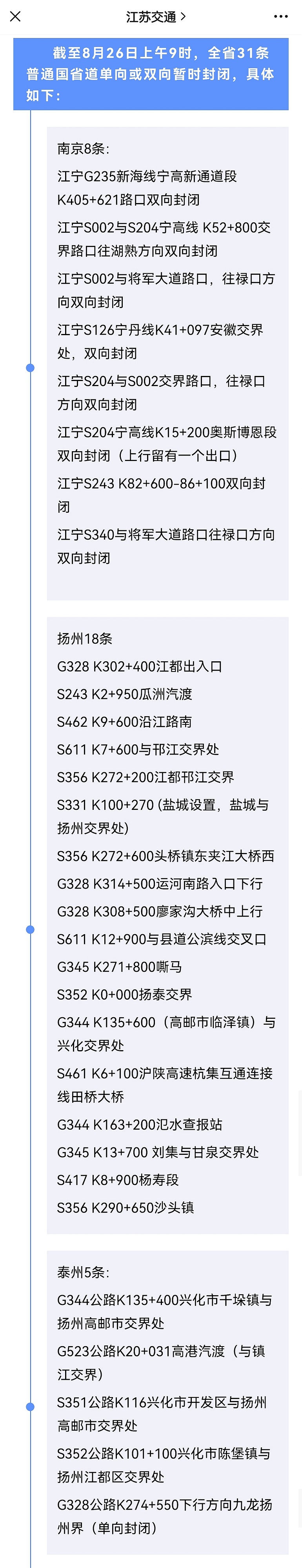 截至8月26日上午9时,江苏全省31条普通国省道单向或双向暂时封闭,具体如下: