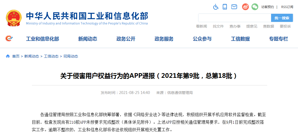 央视网消息:据工业和信息化部网站消息,8月25日,工信部发布关于侵害用户权益行为的APP通报(2021年第9批,总第18批)。要求,被点名APP应按相关通信管理局要求,在9月1日前完成整改落实工作。逾期不整改的,工信部将依法依规组织开展相关处置工作。截至目前,检查发现尚有210款APP未按要求完成整改。