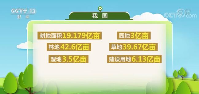 数据显示,我国耕地面积19.179亿亩,园地3亿亩,林地42.6亿亩,草地39.67亿亩,湿地3.5亿亩,建设用地6.13亿亩。数据还显示,10年间,生态功能较强的林地、草地、湿地河流水面、湖泊水面等地类合计增加了2.6亿亩,可以看出我国生态建设取得积极成效。