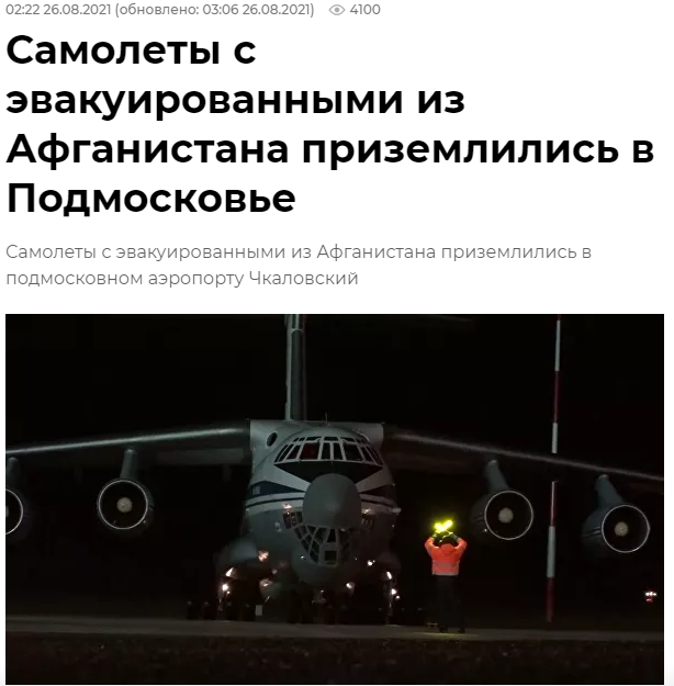 俄罗斯国防部一架伊尔-62和一架伊尔-76飞机不久前已在莫斯科州契卡洛夫斯基机场降落,另外两架伊尔-76也已飞抵。大约100人搭乘伊尔-76飞机,他们大部分是阿富汗裔俄罗斯公民,随后接受边防检查。