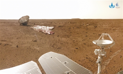 7月12日那天,我在路上遇到了一路保护我的背罩,它的身后还背着那大大的降落伞。我用导航地形相机给背罩和降落伞组合体拍了照,这是我第一次以旁观者的角度完整地看到它们。经过气动烧蚀后的背罩依然结构完整,像龟甲一样翻倾在地上,身后的降落伞宛若一袭白色长裙拖在火星表面,优雅而又坚韧,感谢它们送我来到这里。