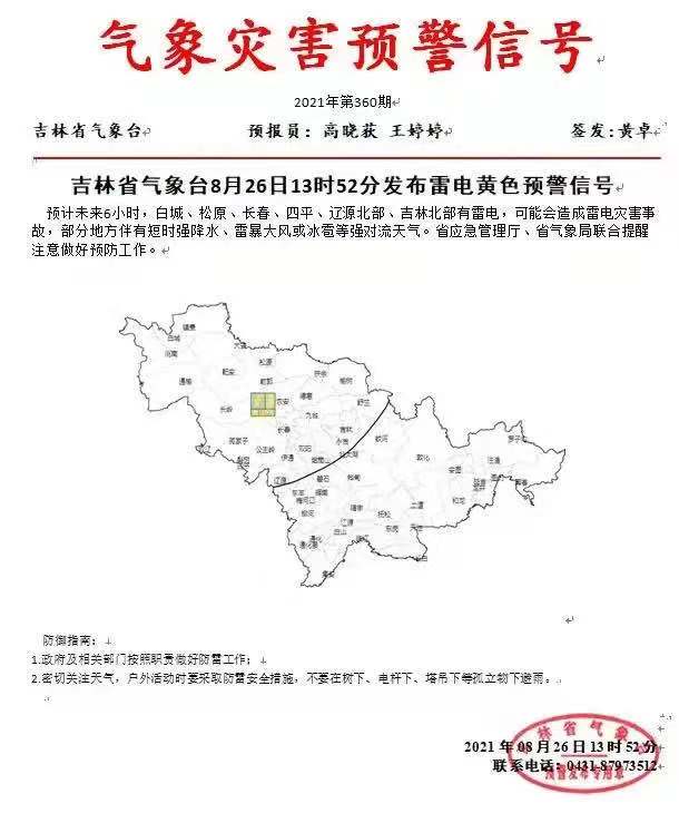 吉林省气象台8月26日13时52分发布雷电黄色预警信号:预计未来6小时,白城、松原、长春、四平、辽源北部、吉林北部有雷电,可能会造成雷电灾害事故,部分地方伴有短时强降水、雷暴大风或冰雹等强对流天气。