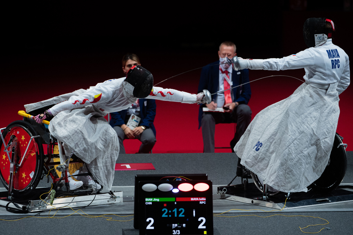 8月26日,在东京残奥会轮椅击剑女子个人重剑A级铜牌争夺战中,边静(左)战胜俄罗斯选手马娅。新华社记者张金加摄