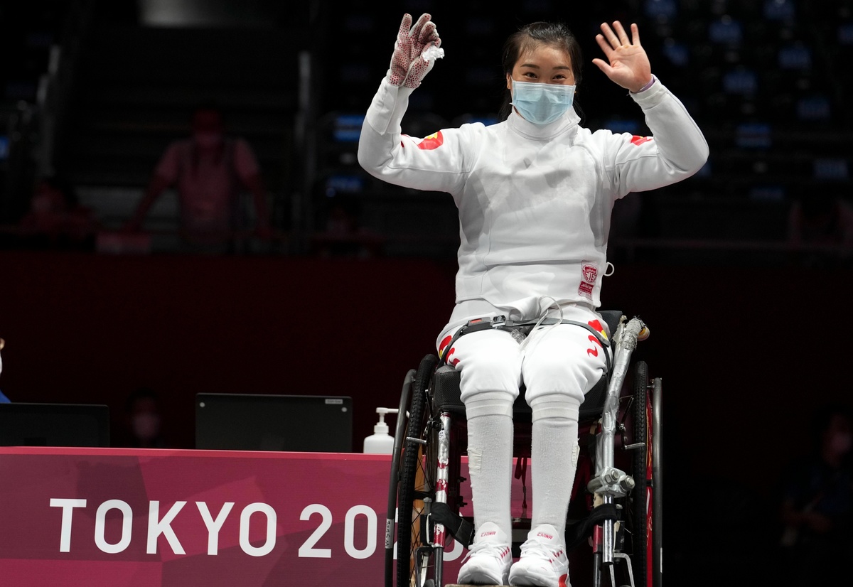 8月26日,在东京残奥会轮椅击剑女子个人重剑B级决赛中,谭淑梅获得金牌。新华社记者胡虎虎摄
