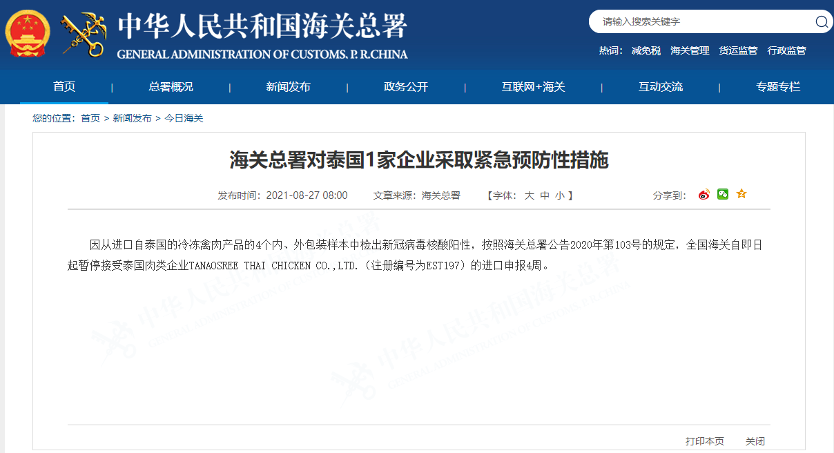 据海关总署官网消息,因从进口自泰国的冷冻禽肉产品的4个内、外包装样本中检出新冠病毒核酸阳性,按照海关总署公告2020年第103号的规定,全国海关自即日起暂停接受泰国肉类企业TANAOSREE THAI CHICKEN CO.,LTD.(注册编号为EST197)的进口申报4周。