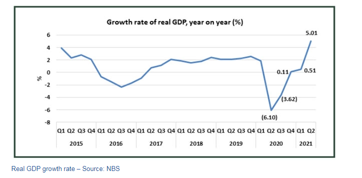 报告称,“2021年第二季度的增长率高于2020年第二季度的-6.10%和2021年第一季度的0.51%,这表明尼日利亚商业和经济活动恢复到接近全国实施新冠疫情相关限制举措之前的水平。”