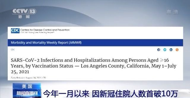 当地时间24日,加州洛杉矶县公共卫生部公布了一份研究报告,报告指出,根据当地5月1日至7月25日的统计数据,未接种疫苗人群的感染率和住院率比完成疫苗接种的人群分别高出4.9倍和29.2倍。研究人员还说,完成疫苗接种的人群仅有3.2%因感染新冠病毒住院。
