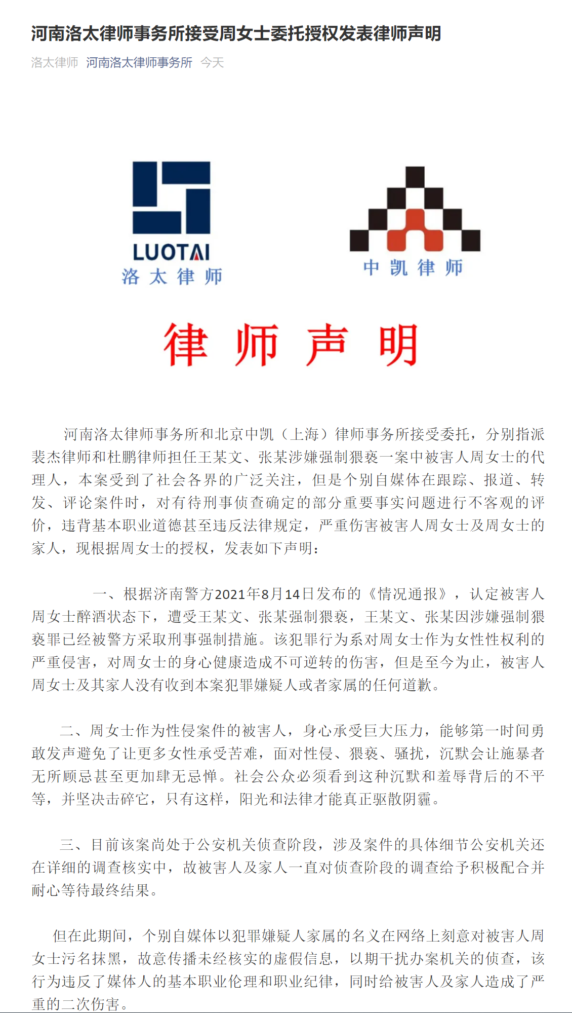 该声明表示,女性的合法权益不容侵犯,网络不是法外之地,对于逾越法律底线、侵害被害人合法权益的相关侵权人,律师提示立即停止侵权并纠正错误做法,被害人周某将保留依法追究侵权者法律责任的权利。