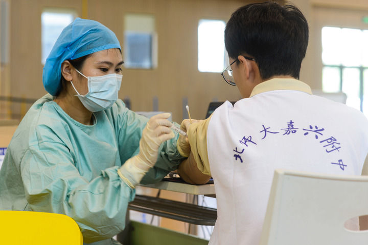8月26日,在北京师范大学附属嘉兴南湖高级中学体育馆,高中学生接种新冠疫苗。新华社记者 徐昱 摄