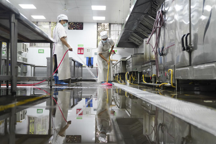 8月25日,在重庆市北碚区朝阳小学,工作人员在清洗厨房地面。 新华社发(秦廷富 摄)
