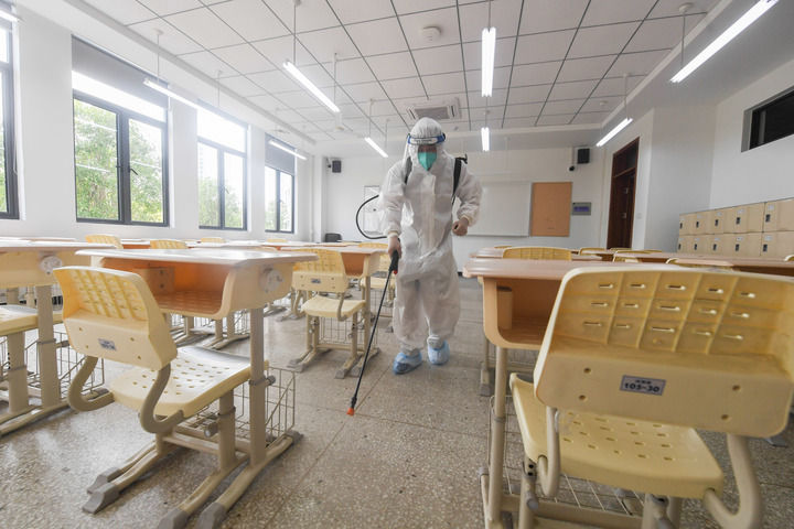 8月26日,工作人员对北京师范大学附属嘉兴南湖高级中学教室进行消杀。为保障中小学秋季开学,浙江省嘉兴市教育部门积极做好各项准备工作。新华社记者 徐昱 摄