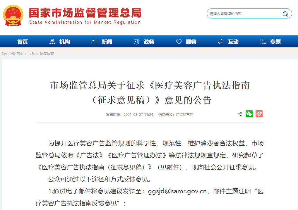 为提升医疗美容广告监管规则的科学性、规范性,维护消费者合法权益,市场监管总局依照《广告法》《医疗广告管理办法》等法律法规规章规定,研究起草了《医疗美容广告执法指南(征求意见稿)》,现向社会公开征求意见。