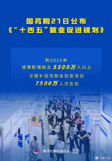 【权威快报|#十四五就业促进规划#来了】国务院27日公布的《“十四五”就业促进规划》提出,将就业优先政策置于宏观政策层面并持续强化,同时提出了健全就业目标责任考核机制、实施灵活就业人员和新就业形态劳动者支持保障计划、广泛开展新业态新商业模式从业人员技能培训、强化城镇青年就业帮扶等一系列促进高质量就业的新举措。(记者姜琳、安蓓;海报设计杨轶群 )