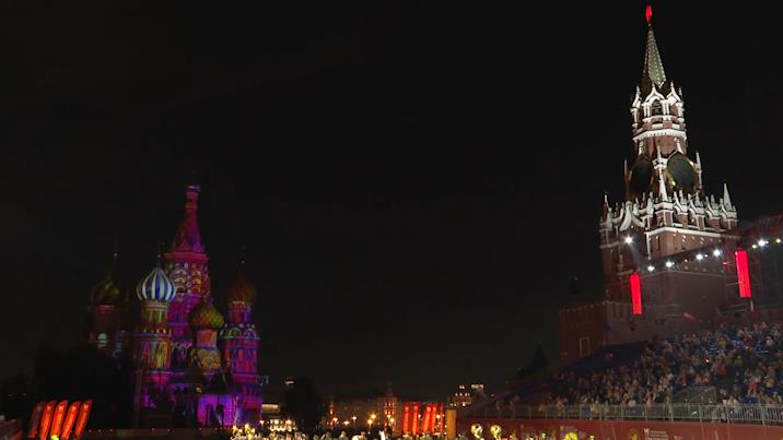 总台记者 宋一平:大家现在看到的,就是红场上的救世主钟楼,它的左侧就是瓦西里教堂。俄罗斯选择在夜间举行军乐节,因为在灯光和火把的映衬下,红场将出现白天难得一见的梦幻色彩。充满异域风情的音乐、服装、歌舞、杂耍,都会给观众留下终身难忘的美好回忆。
