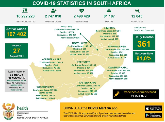 当地时间8月27日南非卫生部确认,南非当天新增新冠肺炎确诊病例12045例,累计确诊达2747018例;当日新增死亡病例361例,累计死亡病例81187例。至今共计2498429人康复。(总台记者 周涛)
