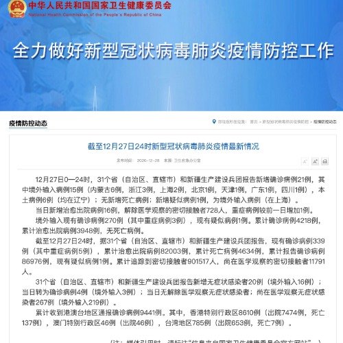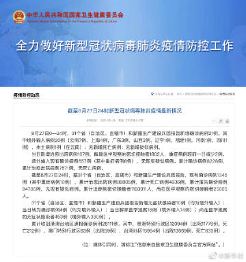 截至8月27日24时,据31个省(自治区、直辖市)和新疆生产建设兵团报告,现有确诊病例1345例(其中重症病例10例),累计治愈出院病例88805例,累计死亡病例4636例,累计报告确诊病例94786例,无现有疑似病例。累计追踪到密切接触者1160911人,尚在医学观察的密切接触者25805人。