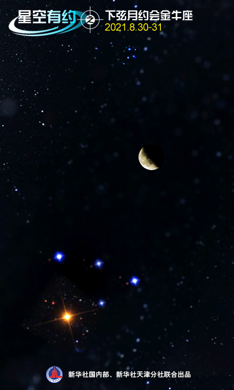 天文科普专家介绍,8月30日,一轮下弦月将运行至金牛座天区,与金牛座中的昴星团相偎,和金牛座的最亮星毕宿五相伴。届时如果天气晴好,我国感兴趣的公众可于30日午夜时分看到昴星团首先露出地平线,月亮跟毕宿五在随后不久携手升起。直至31日日出前,都可以欣赏到它们的曼妙身姿。