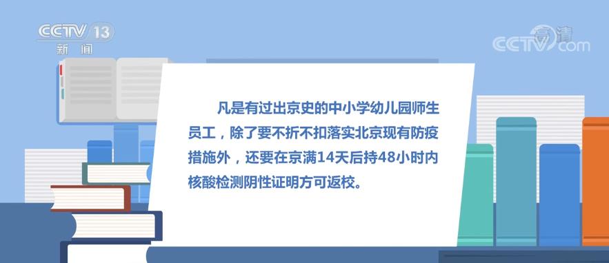 凡是有过出京史的中小学幼儿园师生员工,除了要不折不扣落实北京现有防疫措施外,还要在京满14天后持48小时内核酸检测阴性证明方可返校。