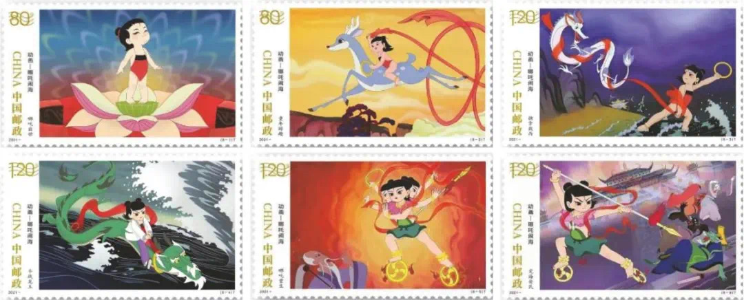 6枚邮票采用6种色调分别展现了动画中哪吒出世、童年游趣、擒拿敖丙、斗战龙王、哪吒重生、定海安民这6个故事情节。整组邮票色彩特征鲜明却又连贯成系。整体设计更借鉴电影中蒙太奇的表现手法,将不同时间、场景、镜头画面重组、拼接,使静止的邮票呈现出完整的动画情节,还原了很多人心中珍贵的童年记忆。哪吒不畏权威的可贵精神跃然呈现于票面之上。