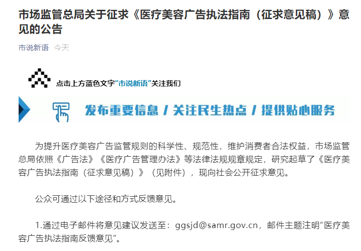近日,为提升医疗美容广告监管规则的科学性、规范性,维护消费者合法权益,市场监管总局依照《广告法》《医疗广告管理办法》等法律法规规章规定,研究起草了《医疗美容广告执法指南(征求意见稿)》并向社会公开征求意见。