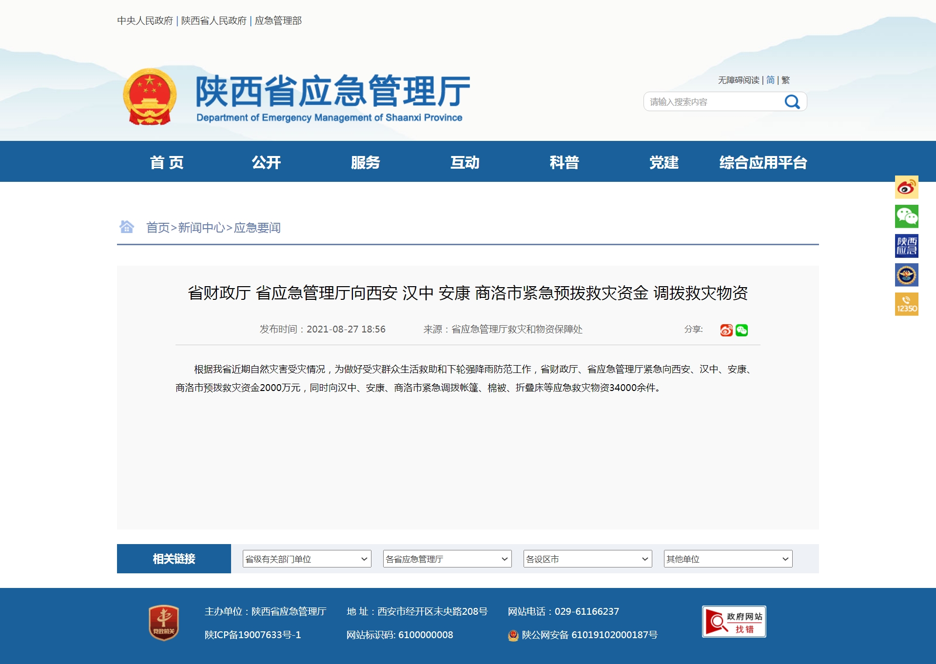 陕西省应急管理厅8月27日发布消息:根据陕西近期自然灾害受灾情况,为做好受灾群众生活救助和下轮强降雨防范工作,陕西省财政厅、陕西省应急管理厅紧急向西安、汉中、安康、商洛市预拨救灾资金2000万元,同时向汉中、安康、商洛市紧急调拨帐篷、棉被、折叠床等应急救灾物资34000余件。(总台记者 杨永青)