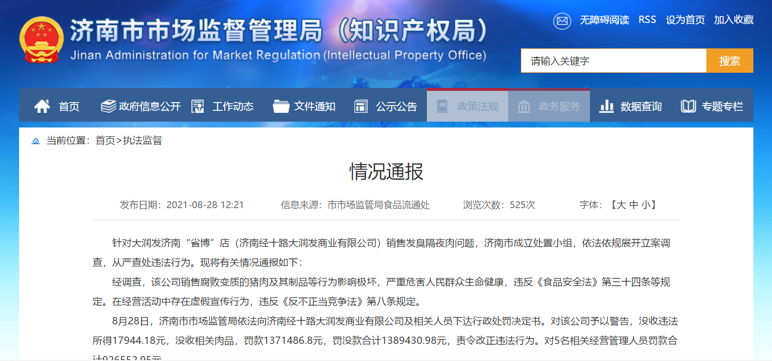 央视网消息:据济南市市场监管局网站消息,8月28日,针对大润发济南“省博”店(济南经十路大润发商业有限公司)销售发臭隔夜肉问题,济南市市场监管局发布情况通报,将经十路大润发商业有限公司食品安全风险等级调整为最高级,纳入重点监管对象,并将该公司列入严重违法失信企业名单,依法依规对其实施失信联合惩戒,同时依法对该公司及5名相关经营管理人员予以罚款。
